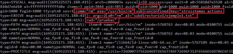 Una vez aplicada la regla (y reiniciado el servicio auditd) probamos a eliminar con el usuario strsistemas el fichero "ejemplo1.txt" que se encuentra en el subdirectorio "subdirectorio1" mientras estamos situados en el directorio "/pruebas", y vemos que esta acción queda registrada en el log. Gracias al campo uid=1000 y al tag "strsistemas_actions" sabemos que la acción la realizó el usuario strsistemas: