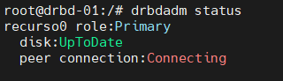 En inicialización y sincronización en el servidor drbd-01 (primario), iniciamos el recurso y lo ponemos en el estado primario: