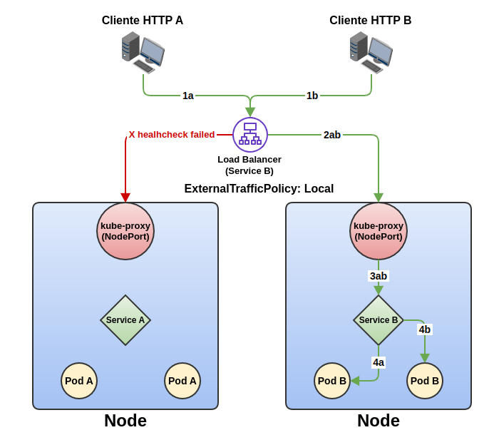 Podemos ver en este ejemplo cómo el cliente A realiza una conexión al servicio B (1a) a través del load balancer. Éste tiene activos los health checks en ambos servidores a pesar de haber un servidor que no dispone de pods del servicio B (el nodo de la izquierda). Por ello, el tráfico es enrutado sin problema a través del nodo de la izquierda (sin pods B) (2a), que mediante kube-proxy, es enviado al Sevice B del nodo de la derecha (3a). Allí el tráfico es enviado al pod correspondiente a través de su Service asociado (4a).